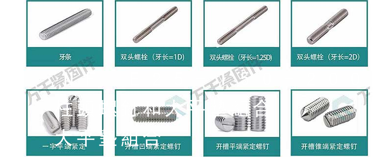 單頭螺柱 Single end studs 地腳螺栓 Masonry bolts 帶槽圓螺母 Slotted round nuts 端面帶孔圓螺母 Round nuts with drilled holes in one face 開槽平端緊定螺釘 Slotted set screws with flat point 開槽錐端緊定螺釘